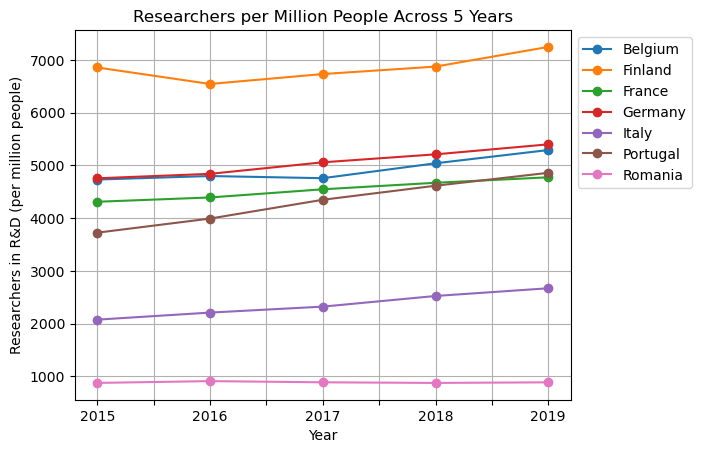 RDpivot.plot(marker='o', title="Researchers per Million People Across 5 Years")