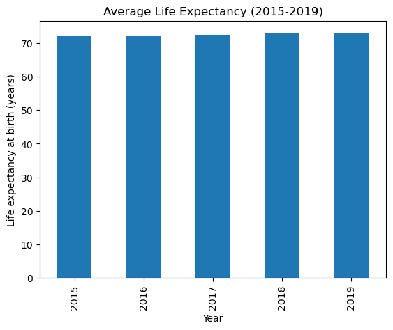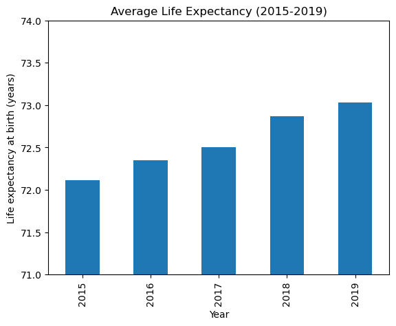 yravg.plot(x="Year", y="Average Life Expectancy", kind="bar", title="Average Life Expectancy (2015-2019)", legend=False)